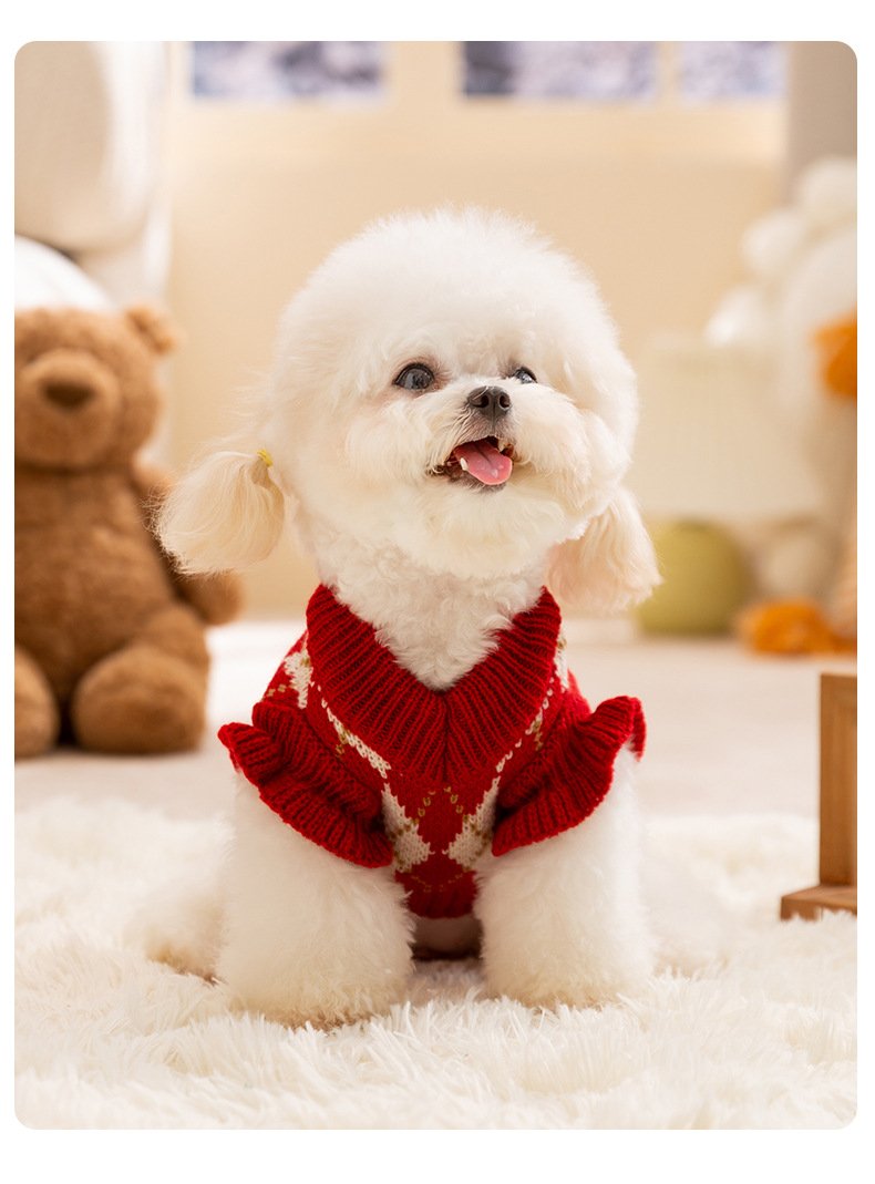 Festive Dog Sweater with Rhombus Embroidery & Cherry Pattern for Halloween & Christmas, Pet Apparel for Small Dog Breeds